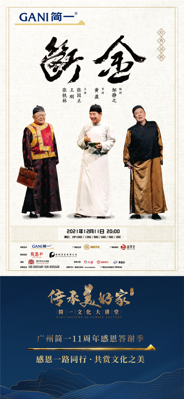 铁三角张国立、王刚、张铁林时隔17年再度合体,由他们三位老戏骨领衔主演经典话剧《断金》,将于12月11日在广州中山纪念堂精彩上演。本剧有著名编剧邹静之先生编辑,10打磨剧本,13次易稿,铁三角倾情主演,全实景舞美,气势磅礴,经典演绎京味十足的老北京故事!本次活动由GANI简一荣誉主办,也是广州简一11周年感恩答谢季的系列活动之一。据悉本次演出的票价为VVIP1680、VIP1280,880、680、480、280元,广大剧迷朋友可以通过大麦网、猫眼、票星球、广州中山纪念堂等官方渠道购买门票,机会实属难得,铁粉们一定不能错过哦!