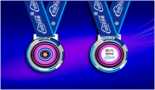 跑遍中国2022“中控采供管”马拉松线上赛电子完赛奖牌的创作设计灵感源自2022冬奥会的奖牌“同心”理念。寓意为“多环同心,同心归圆”,牌体由圆环加圆心构成,奖牌正面中央为多个套环,圆环中间为大核心,大道至简,简约而不简单。奖牌颜色设计采用深蓝意为科技创新的力量,“蓝、白、紫”三色相衬代表激情和活力,吉祥和美好的象征。奖牌挂带设计采用蓝色与牌体蓝、粉色结合,整体极具运动美感、展现青春活力和蓬勃发展之意。
