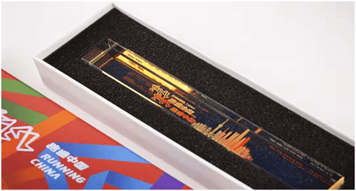 跑遍中国2022“中控采供管”马拉松线上赛水晶奖印作为赛事奖品的创意来自设计师的一次伟大的的灵感。什么是荣誉?每一个勇敢的跑者都值得拥有属于自己、独一无二的荣誉,因为在这个漫漫竞技场上,每个坚持完赛的跑者,都是勇敢的战士。在古代水晶被奉为珍宝,水晶与印刻搭配在一起是王者的象征。这份定制水晶奖印,记录着每一次跑步的独特印记。是一种坚持精神,一种挑战而胜利的荣耀。