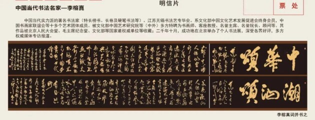 李榕真,中国当代实力派的著名书法家(特长榜书、长卷及硬笔书法等)。江苏无锡书法艺专毕业。中国民主促进会会员。系文化部中国文化艺术发展促进会终身会员,中国中外名人文化研究会、中国书画家联谊会、国际美术家联合会、中韩文化艺术专家委员会等十多个艺术团体成员。