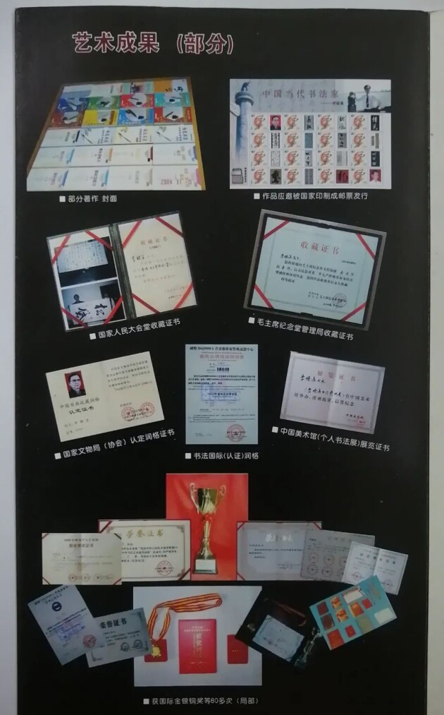 其作品及传略已载入文化部的《中国艺术大家》、《新中国国礼艺术大师》、《百年经典~中国书法全集》、《中国书画》、《中国历代书画名家辞典》、《中外名人大辞典》、《中国当代名人录》、《世界名人录》、《世界华人书画篆刻名家大辞典》、《世界当代著名书画家真迹博览大典》(启功题签)、《二十世纪中日书画名匠集》、《中日现代美术通鉴》、《百年经典~中国电影百年书画大展》(多位党和国家领导人亲自为本书及大展题词)、《中国近现代书画选集》、《中华人物大典》、《中国现代硬笔书法精英》、《国际硬笔书法家大辞典》等几百部中外各类名人辞书(典集)。他曾多次成功地策划并主持“南北名家书画联展” 并参展。曾多次出席北京人民大会堂、钓鱼台国宾馆、全国政协礼堂等颁奖大会等各类活动,多次受到国家领导人的亲切接见并集体留影。他以德传艺,学生无数(有多位在各类书法大赛中获奖)。自2022年春节前后至今,其事迹及艺术成果己应邀在《中华英才》、《名人辞典》、“凤凰网”、“CCTV网”、央视“老故事”栏目等几十家媒体分别宣传报道。