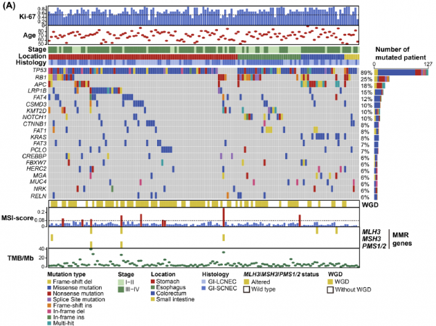 此次研究招募了被确诊为纯GI-NEC、尚未接受新辅助治疗的患者,并收集胃肠道不同解剖部位的NEC组织和邻近正常组织样本,通过NGS平台进行全外显子组测序,以此表征GI-NEC的基因组特征及其异质性。