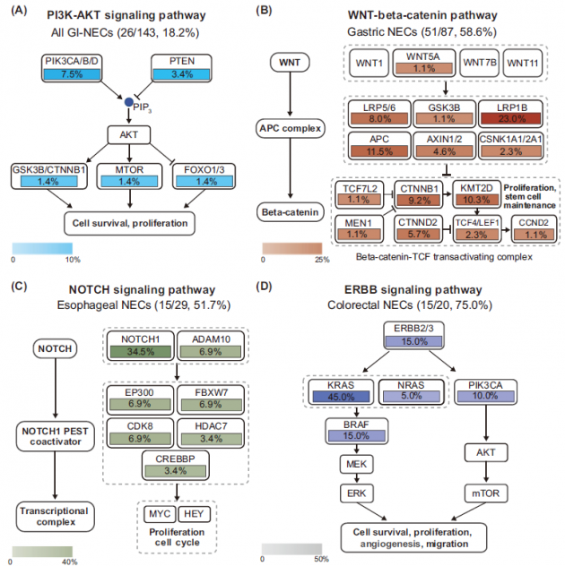 对胃肠道不同部位NEC的突变基因进行通路富集分析,结果表明,WNT-β-连环蛋白通路基因突变出现在58.6%胃NEC中,NOTCH通路基因突变出现在51.7%食管NEC中,ERBB信号通路基因突变则出现在在75%结直肠NEC中。可见,基因组改变的关键信号通路呈现出NEC肿瘤部位的异质性(图2A-D)。