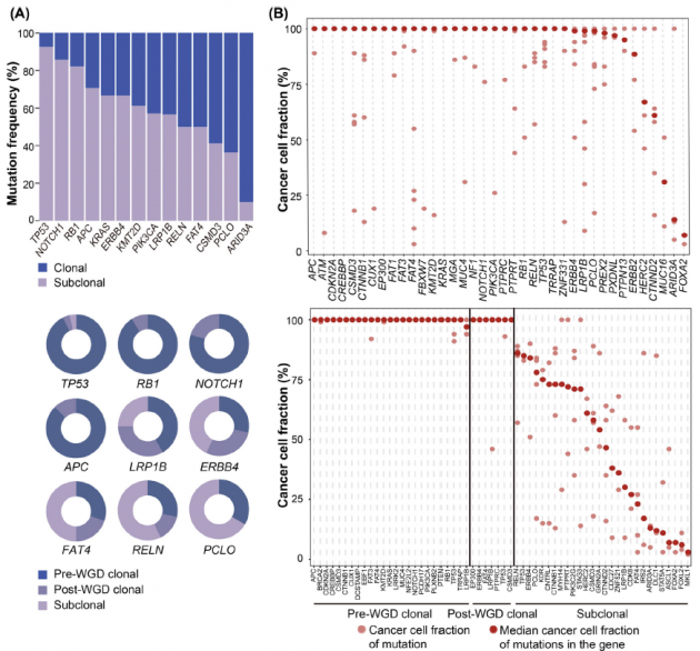 依据突变克隆性和与WGD相关的潜在时间顺序,以此进行分组的比较分析,得出的结果支持一个理论的产生:GI-NEC肿瘤细胞首先在TP53,RB1、NOTCH1和APC出现克隆突变,随后在出现WGD前后,癌症相关基因(LRP1B、CSMD3、FAT4和ERBB4等)出现克隆突变,最后在RELN、PCLO、MKL1等基因中发展出亚克隆突变(图5B-D)。