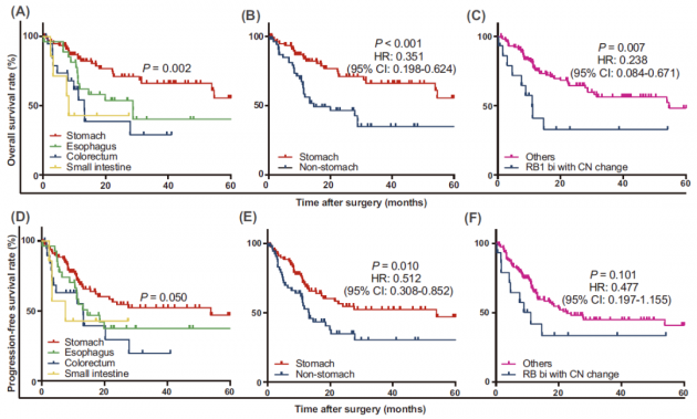 最后,探究关联预后的因素。结果表明,发生NEC的胃肠道不同部位、出现CNV且携带RB1双等位基因失活均为与患者总生存期显著相关的独立预后因素。其中,与其他部位NEC相比,胃NEC患者总生存期显著更长(图6A-F)。