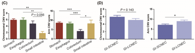 此外,不同部位NEC间存在CNV负荷的组间差异,而在GI-LCNEC和GI-SCNEC之间观察到相似或相差不大的CNV负荷,这表明NEC的CNV负荷受不同部位的影响,而受组织学亚型的影响有限(图3C-D)。