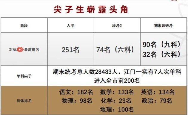 (以江门某校251名后的成绩,进入江门一实高中部——一个学期后,4人进入全市100,7人进入全市200。进步难能可贵!)