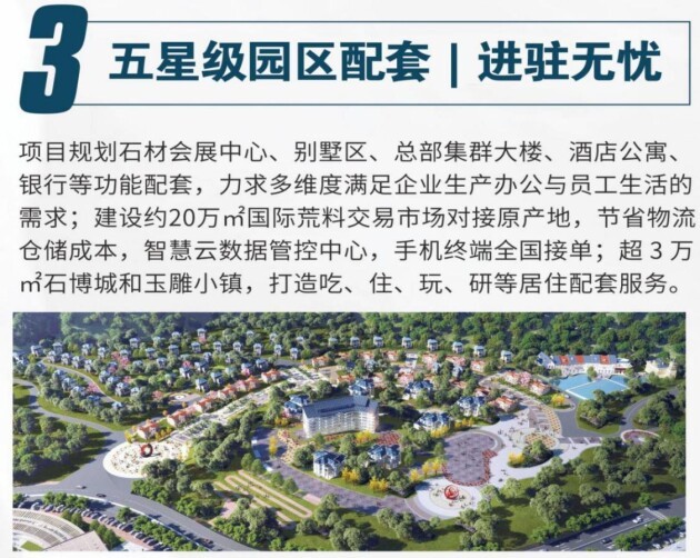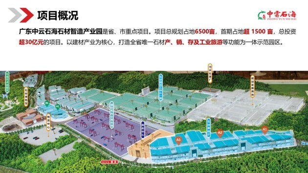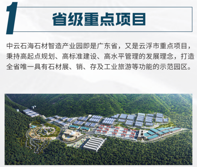 据悉,中云石海石材智造产业园是广东省、以及云浮市两级重点项目,高战略、高规划、高智慧、高建设、高环保、高配套、高协调、高管理,“八高打造标杆”。项目投资金额超30亿元。规模宏大的石材产业园——首期1500亩,吸引超1000家企业入驻经营,以打造白石世界石材商贸中心、国际石材荒料交易中心、 智造加工中心、石文化博览中心、企业总部中心、物流中心等“六大核心”的全产业链(闭环)园区,引领并推动整个石材产业的高质量发展。