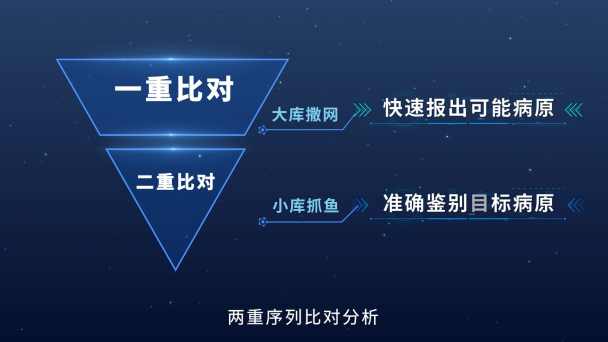 吉因加通过高性能自研专利算法,进行两重序列比对;一重比对,通过大数据库进行撒网,确保病原快速全面报出;二重比对,通过小数据库进行捞鱼,精准鉴别目标病原。