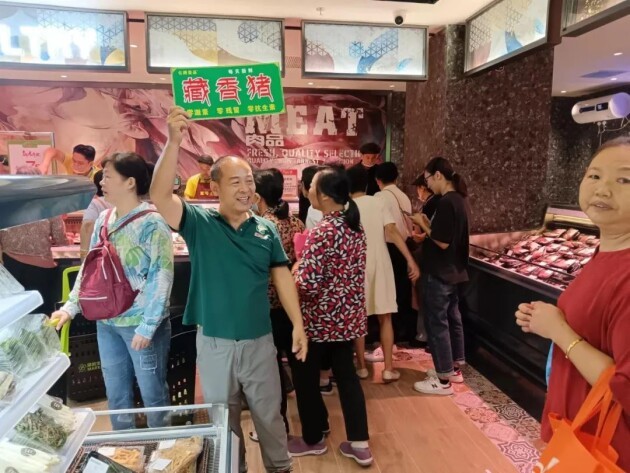 图为2023年10月29日,中山东区简致生活超市开业!亿腾牧业工作人员现场向中山百姓介绍高品质的藏香猪猪肉。